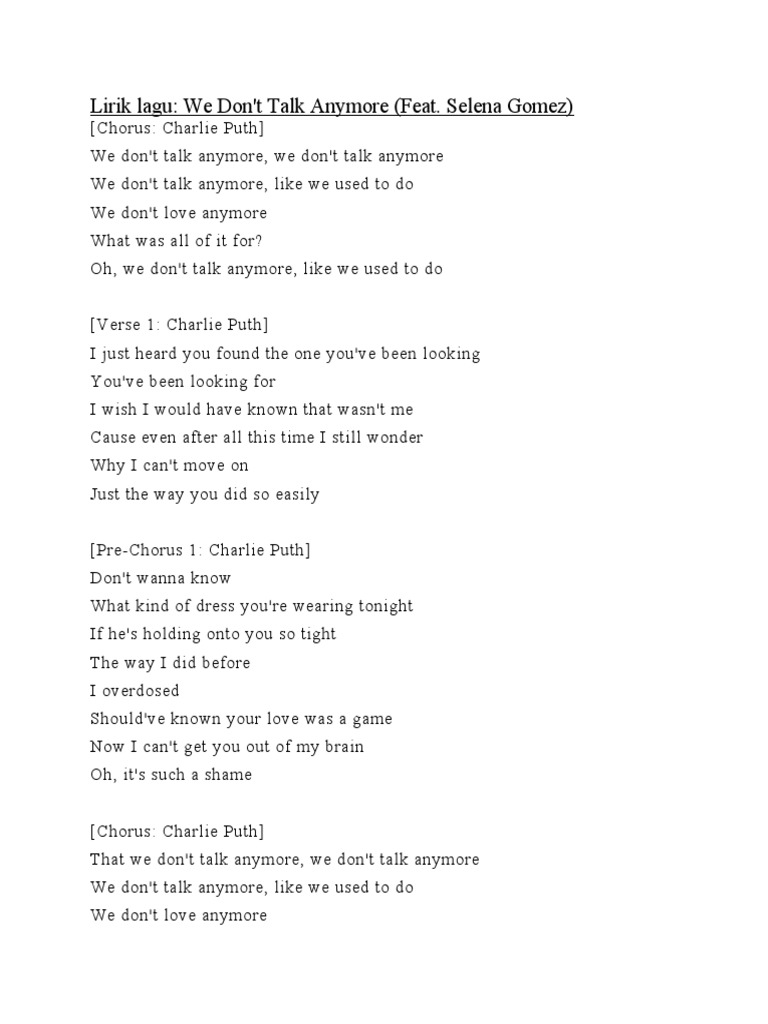 Lirik Lagu We Don T Talk Anymore Charlie Puth Feat Selena Gomez