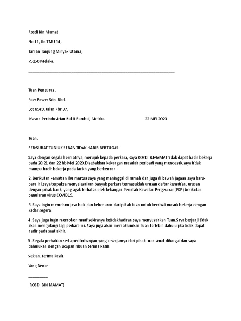 Nak cuti sakit tanpa sijil rasmi kerana demam atau ke luar negara kursus kematian perkahwinan covid 19 contoh surat tidak. Surat Tunjuk Sebab Tidak Hadir Kerja. Surat Tunjuk Sebab Beserta Contoh.